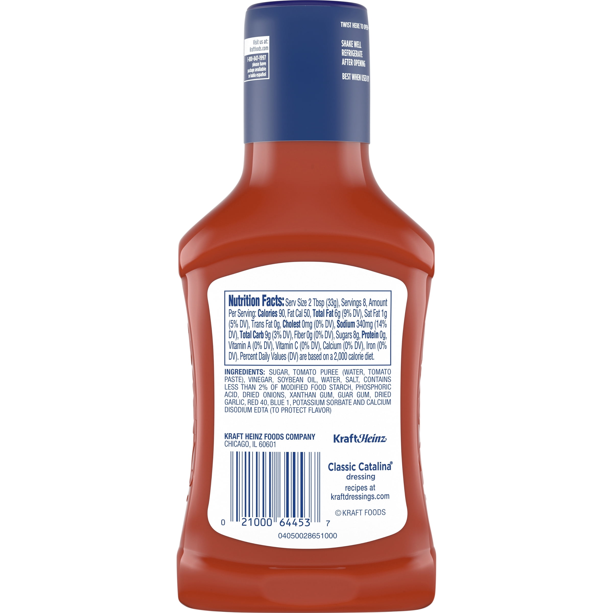 Kraft Fat Free Classic Catalina Dressing - H-E-B Nutrition Facts Fat Free Classic Catalina Dressing Serving Size 2.00 tbsp (35g) Serving Per Container 16 Amount Per Serving %DV *Percentage Daily values are based on a 2,000 calorie diet.Your Daily values may be higher or lower depending on your calorie needs we recommend Kraft Fat Free Thousand Island Dressing, 16 oz $2.60 each ($0.17/oz)