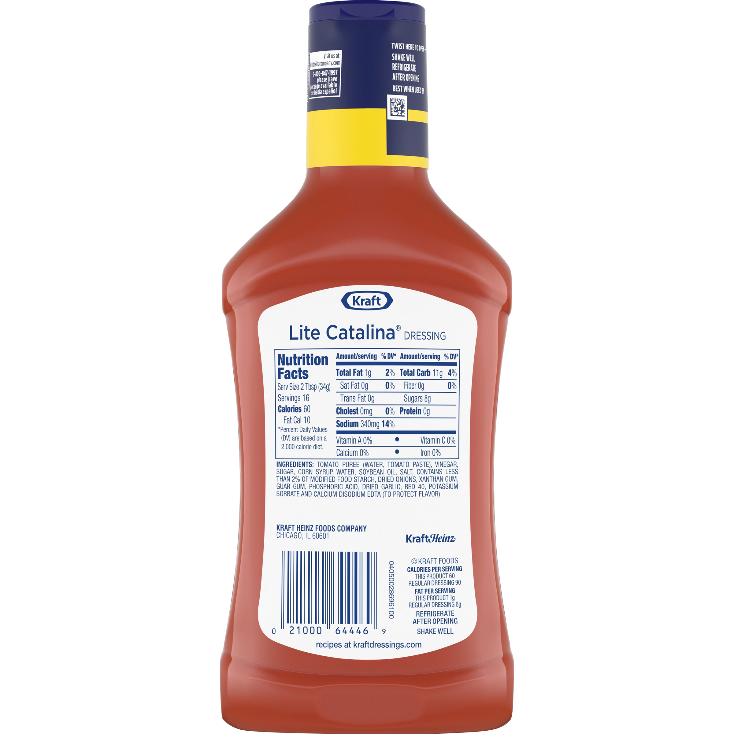 Kraft, Lite, Classic Catalina Dressing, 16oz Bottle (Pack of 3) Amazon.com : Kraft, Lite, Classic Catalina Dressing, 16oz Bottle (Pack of 3) : Salad Dressings : Grocery & Gourmet Food ... Serving Size: 2 Tbsp Servings Per Container: 16 Amount Per Serving Calories 60.0 Calories from Fat 10 Total Calories 960 Total Calories from Fat 160 % Daily Value* (DV) Recommended DV Total Fat 1 g 2% 65 g Saturated Fat 0 ...