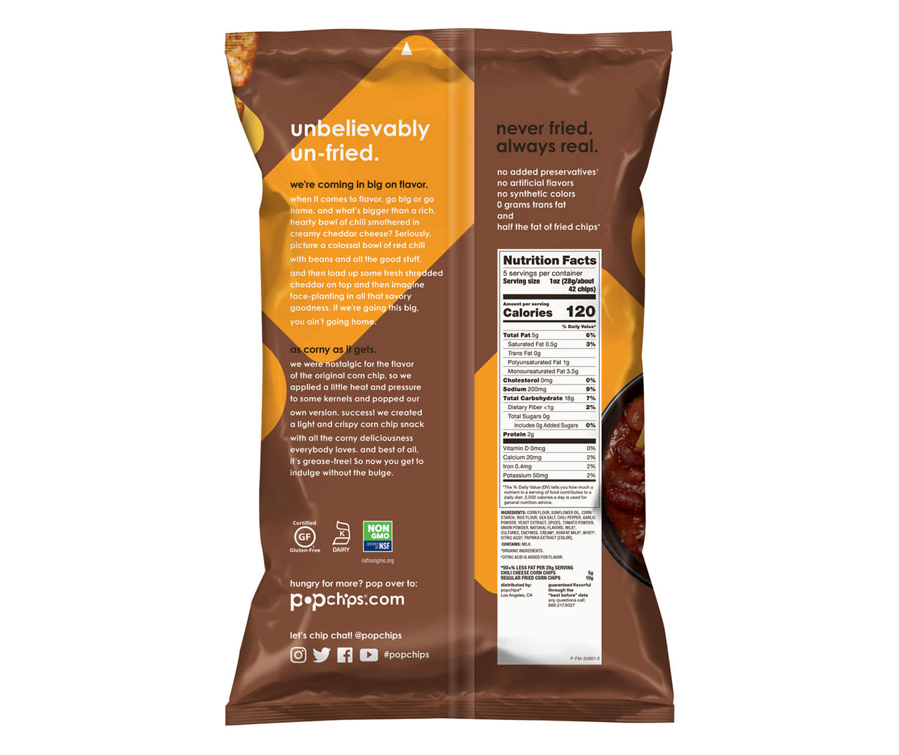 FRITOS® Chili Cheese Flavored Corn Chips | FritoLay FRITOS® Chili Cheese Flavored Corn Chips | FritoLay FRITOS®Chili Cheese Flavored Corn Chips The popularity of FRITOS®corn chips puts this iconic snack in a class of its own. From small towns and family barbecues to parties in the big city, this classic snack is still satisfying fans after more than 80 years. Buy Online Nutrition Facts