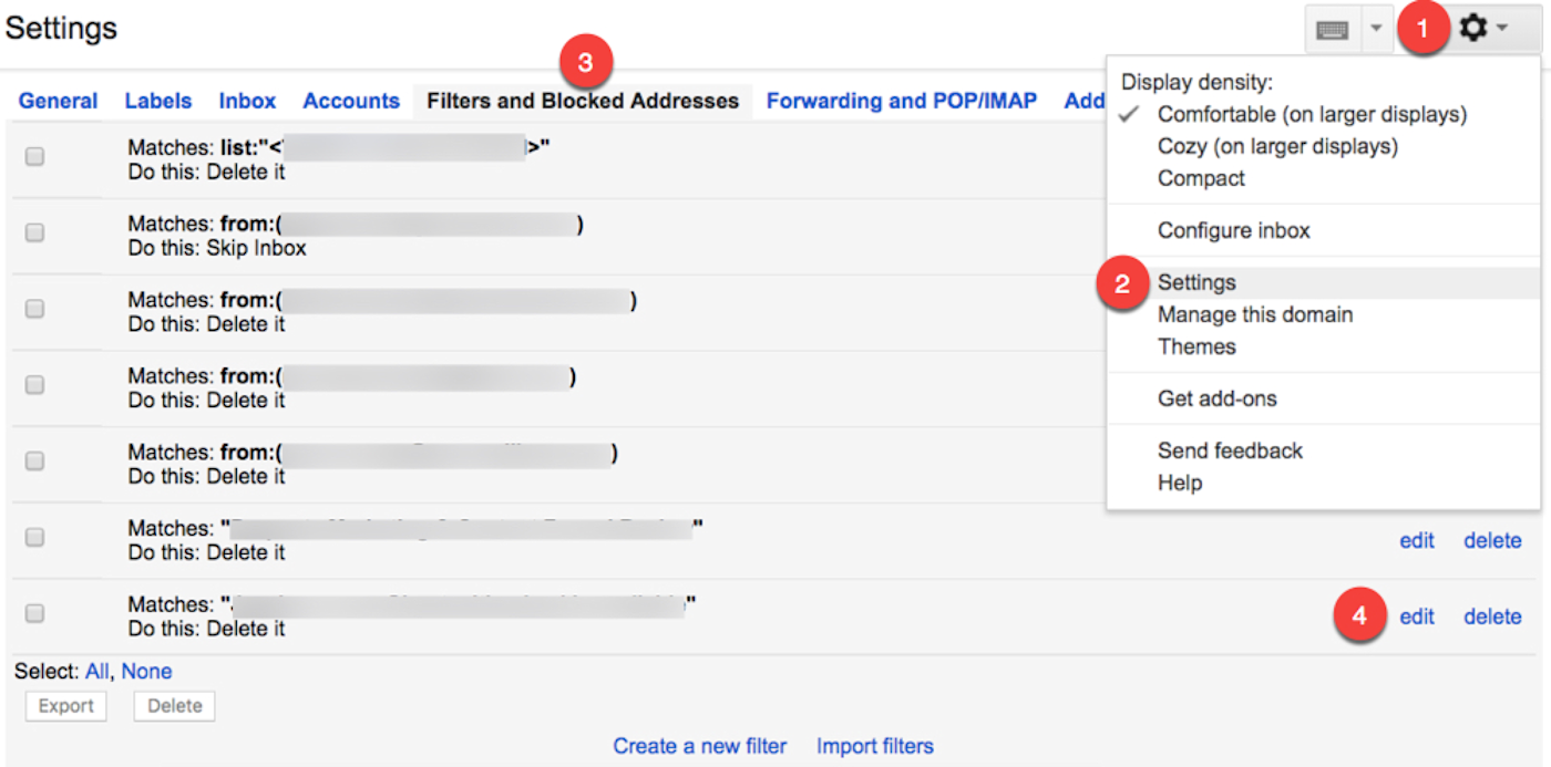 How To Remove a Gmail Filter - wikiHow 1 Open your Gmail. Go to on your computer and log in if you haven't already. 2 Click on ⚙. It's the Settings icon located at the top right-hand corner of the page. 3 Click Settings. This will open your Gmail's quick settings. Click See all settings atop this new sidebar to find the section we need. 4