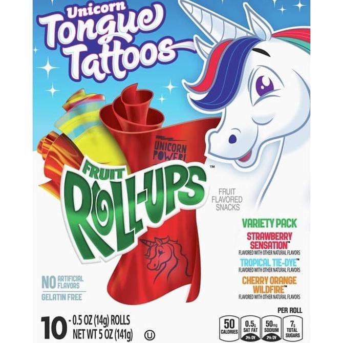Fruit Roll-Ups™ Sour - BettyCrocker.com Fruit Roll-Ups fruit flavored snacks. Now in two Sour flavors - Sour Blue Raspberry and Sour Berry Punch. Each roll comes with an assortment of sour-inspired tongue tattoos. ... ON-THE-GO SNACK: 50 calories per roll, these individual snacks are the perfect addition to any day out. BOX CONTAINS: 1 box, 10 rolls .50 oz each