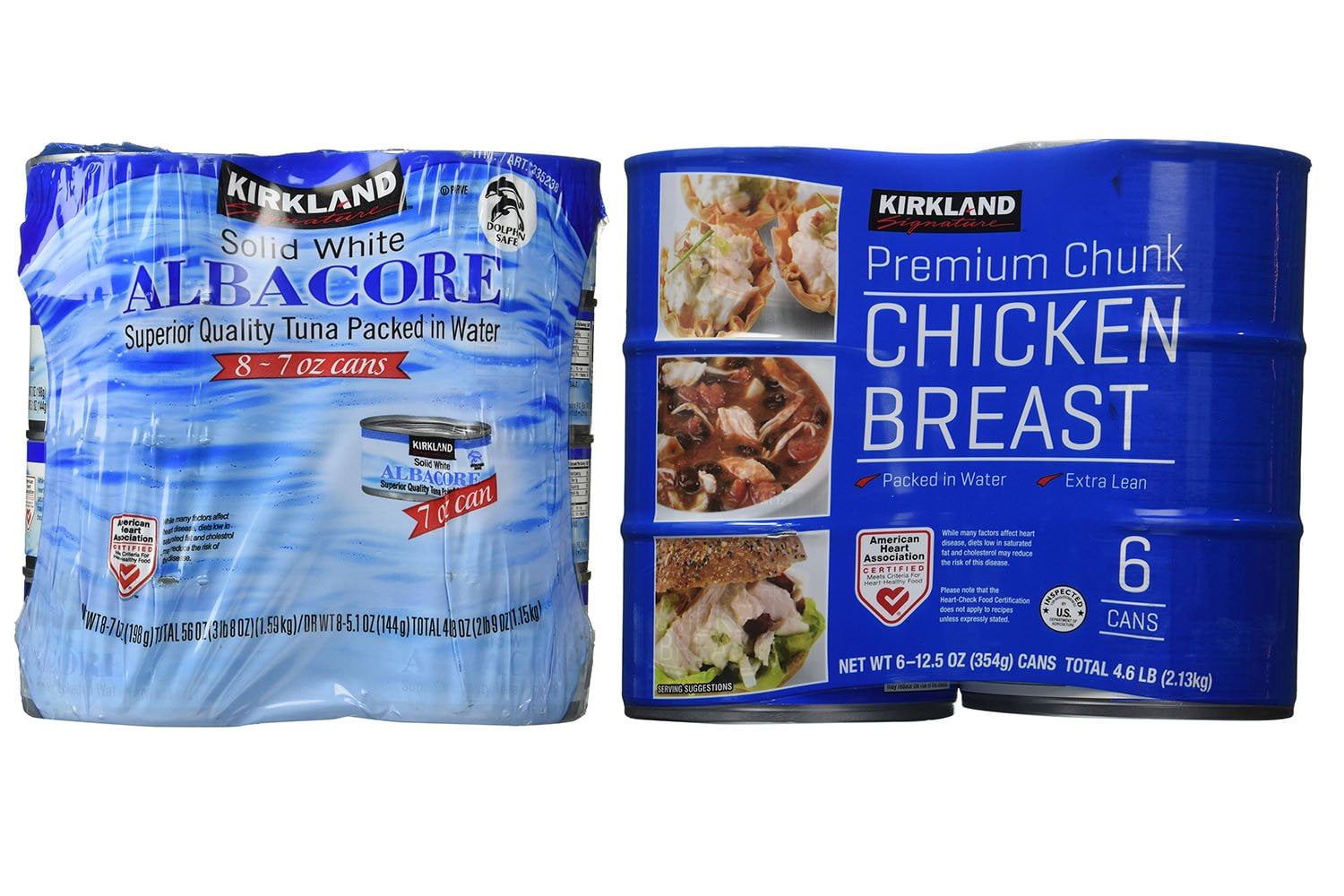 Kirkland Albacore Solid White Tuna in Water - amazon.com Kirkland Chicken Breast in Water 12.5 oz. cans - 6 count - Premium Chunk - Great for chicken salad, quesadillas, soups, and casseroles, $39.99 ($6.67/Count) Kirkland Signature Chicken Breast, 12.5 Ounce (6) (Pack of 6) 1,771, 26 offers from $26.50, Genova Premium Yellowfin Tuna in, Wild Caught, Solid Light, 3 oz. Can (Pack of 8) 794,