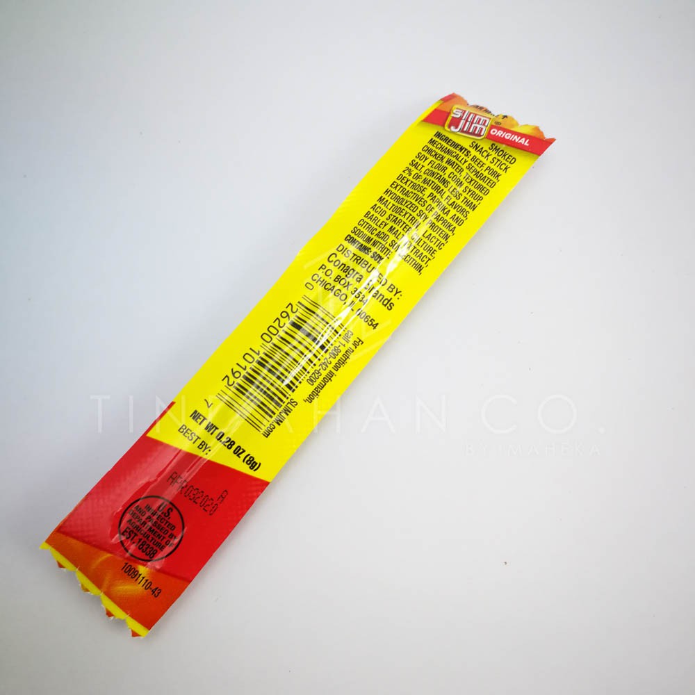 SLIM JIM ORIGINAL STICK 0.44 OZ | Conagra Foodservice These meaty snack sticks are made with no artificial flavors, no artificial colors and a combination of beef, pork and chicken. Snap into a Slim Jim and snack like the beefy boss you know you are. * 2 g protein, 2 g net carbs (2 g total carbohydrates minus 0 g dietary fiber) and 0 g added sugar per 0.44 oz. stick Measure Packaging Size: