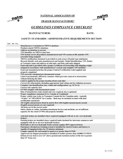Importation and Certification FAQs | NHTSA Manufacturing motor vehicles within U.S. borders. VIN and Manufacturer Identification Requirements for Trailer Manufacturers. Tire & Rim Specifications for Trailers. Technical Data Concerning Trailer Manufacturing. Incorrect VIN Numbers. Information Regarding Federal Requirements for Trailer Brakes, Tow balls, Safety Chains and Breakaway Devices.