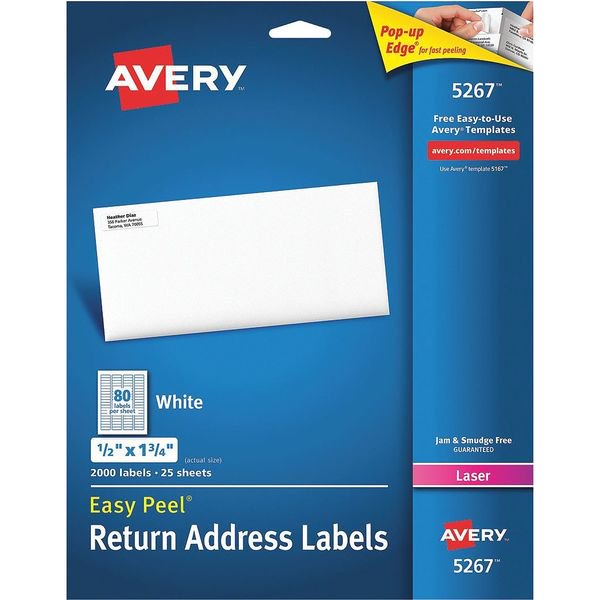 › avery-5267-easy-peel-1Avery® 5267 Easy Peel 1/2" x 1 3/4" Printable Return Address ... Avery 5267. DetailsStandardize your letters and packages with the Avery® 5267 1/2" x 1 3/4" white return address labels. Each label can be customized with your return address using a laser printer, making it easy to mail out bulk letters, bills, or promotions. Boasting a bright white design, these labels naturally enhance the contrast against ...
